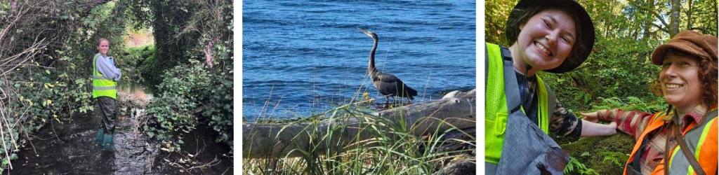 Photos L to R: Sunday Team B surveying at the Sewer District | A heron fishing in the Sound, photo by Kiki B. | Monday Team B enjoying a day in the streams