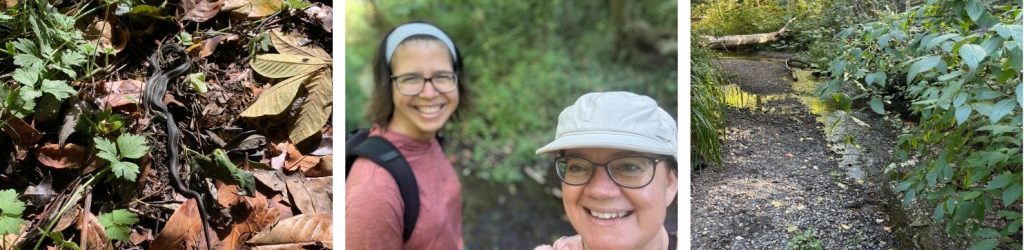 Photos L to R: Garter Snakes soaking in the sun | Wednesday Team B enjoying the mild weather | Low water in the creek due to lack of rain, photo by Nicole B.