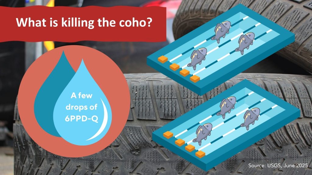 Within the past couple of decades we’ve learned of the deadly impacts of stormwater on salmon, specifically coho. Urban runoff carries with it a myriad of pollutants that are harmful to our watersheds, including the deadly 6PPDQ (a byproduct from tires) which is responsible for killing up to 90% of coho returns annually. Just a few drops of this concentrated poison is enough to kill all the salmon in two (2) olympic-sized swimming pools.