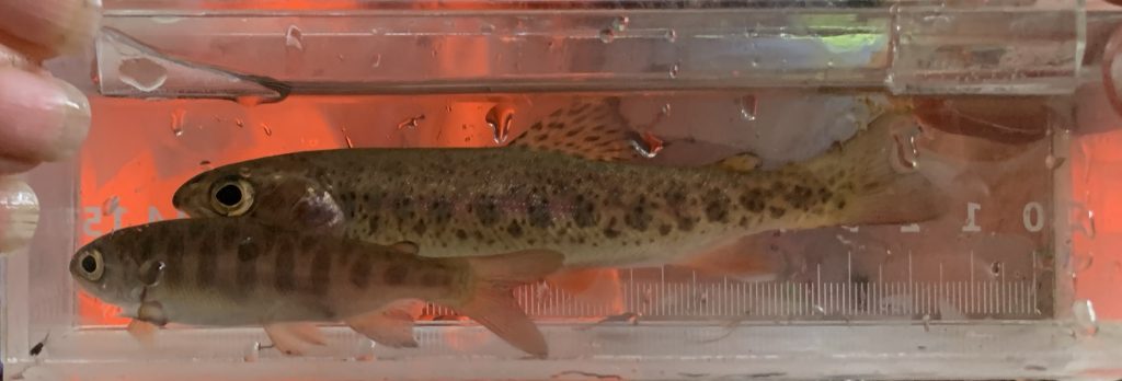 Above are a juvenile coho (front) and resident cutthroat (back) side by side for comparison. Listed below are the main distinguishing features between these two fish:
