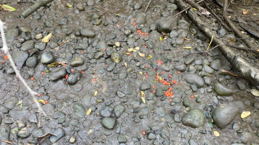 With only 3 live salmon spotted, and 1 dead salmon collected, there has been a dramatic decrease in fish sightings. This is in part due to our erratic weather systems: warm, sunny days followed by a day or two of intense rain with flows strong enough to wash the fish out of the streams.