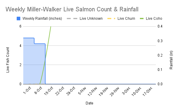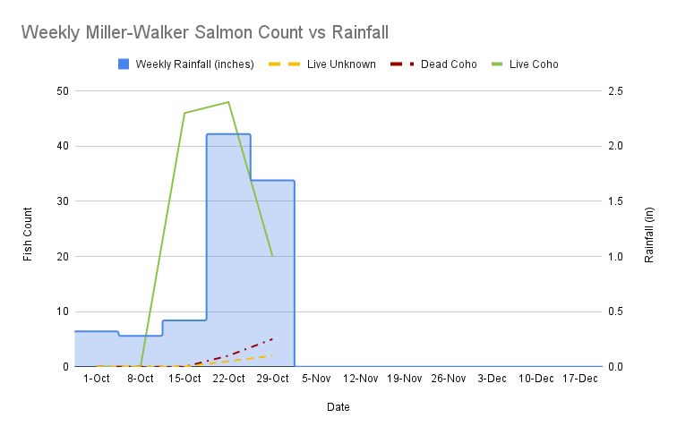 - The first was in mid-October with the most fish seen in 1 week totaling 49 (48 coho and 1 UNK)