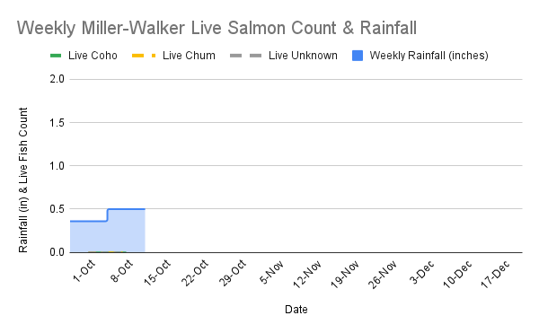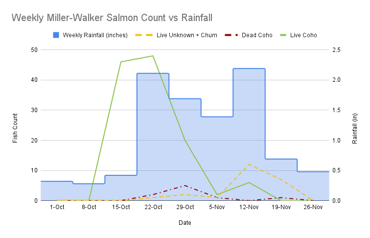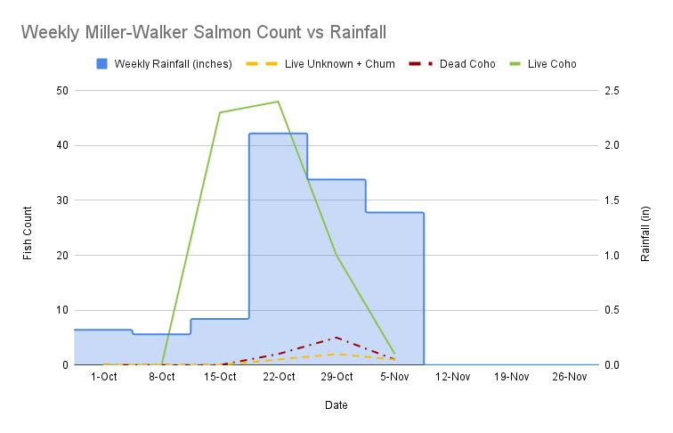 We can see we started off with a pretty dry start to the season, with enough rain to pull fish into the Duck Pond on Lower Walker. You can see that both bumps in fish correspond to the largest amount of rainfall in a week. This further highlights the importance of fresh rainfall with salmon returns.