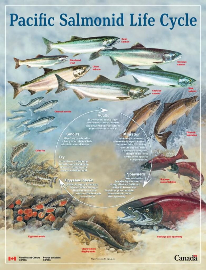 This development process is why other species, like the beaver, are so important to the salmon’s survival. Turbulent flows can push fry out to the Sound too soon, or can suffocate them with too much sediment washing off from nearby homes and roadways. As we learned last week, the beaver dams slow the water flow and reduce turbidity, creating healthier steam systems for the young fry. More fry surviving to adulthood, allows this incredible life cycle to continue.