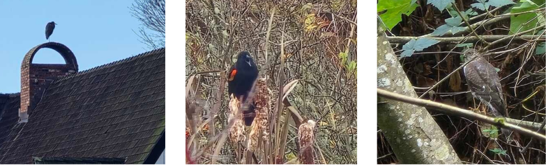 From Left to Right: A heron perches on a nearby roof; a red-winged blackbird calls in the estuary; a sparrow hawk sits camouflaged in the woods (photos by Kiki B.)