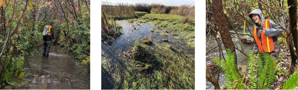 From Left to Right: Friday Team A wades through the flooded boardwalk along Lower Miller (Photo by Anthony H.); The estuary filled with rain water along Lower Miller and Walker (photo by Dawn N,); Thumbs up from the Thursday Team A (photo by Carol B.)