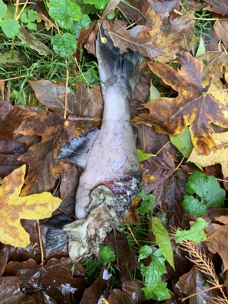 A photo of a partially eaten male coho found along Upper Walker.