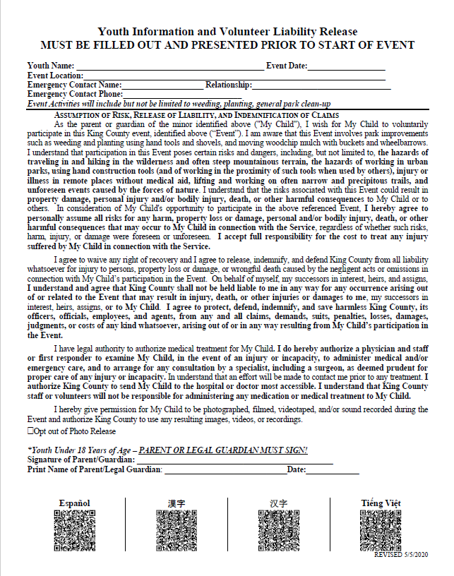 If you are under 18 years old are are volunteering without your parent/ guardian – you need to print and have your parent/ guardian sign both of the forms below. Please bring the printed and signed forms to the volunteer event and give them to the staff member running the event. You only need to complete this process once every year.
